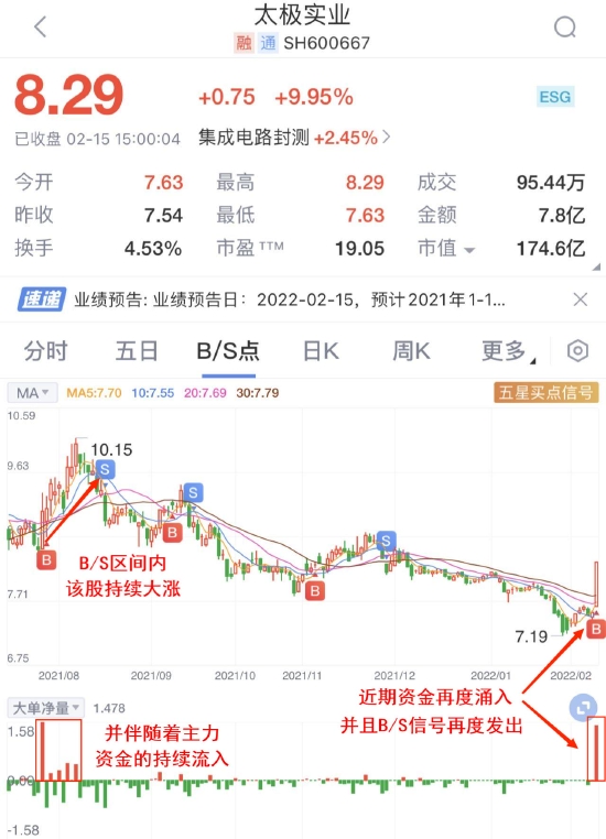 以今日涨停的太极实业为例,通过查股网Level-2的大单净量发现,近期,主力资金持续流入该股,另外,近期B/S点信号再度发出,意味着该股近期再度获得资金关注。此前,B/S点信号发出后伴随主力资金持续流入,该股一度持续大涨。
