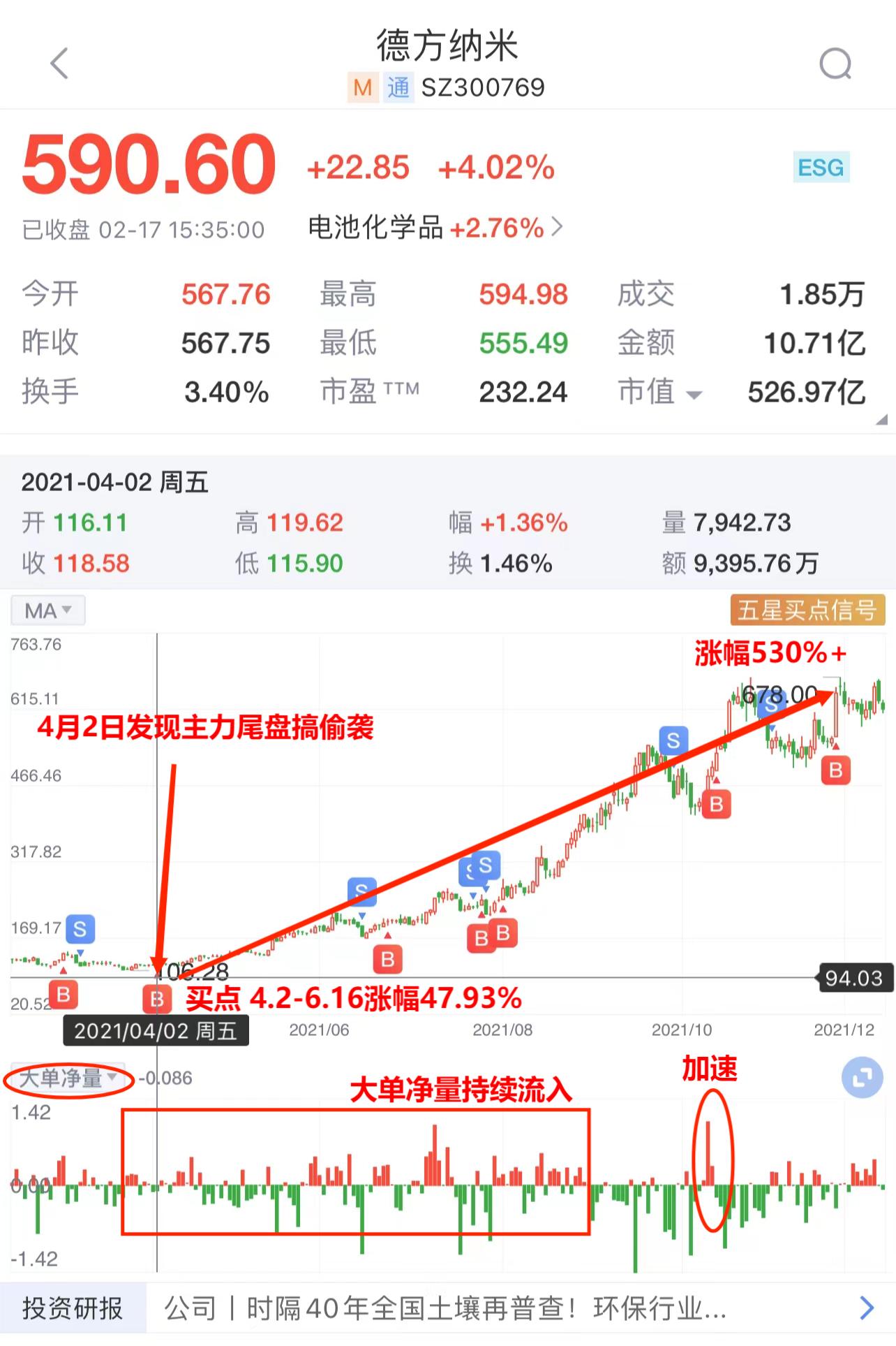 4月2日,尾盘掘金发现了主力在德方纳米的尾盘搞偷袭,并在当天14点50分进行了异动提醒。4月中旬,主力资金开始大幅流入,同时也推动了股价的不断上涨,德方纳米的股价从107元左右涨到了678元左右,最大涨幅超过530%。