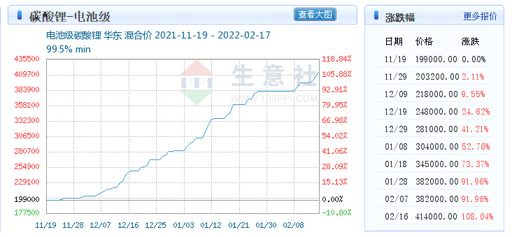这种爆炸式的会顺着产业链传导至最上游的原材料市场,最终结果就是导致了电池级碳酸锂的疯狂涨价。截至2月17日,电池级碳酸锂的报价高达41.4万元/吨,相比11月19日的19.9万元,涨幅高达108.04%,而前后只有3个月的时间。