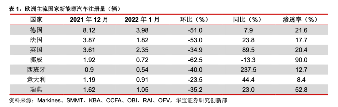 欧洲:假期后遗症+年初传统淡季冲击,1月销量季节性回调符合市场预期。年初作为传统淡季以及受12月份年底效应的影响,此外12月底的圣诞节叠加元旦,假期效应下欧洲车企和经销商仍处于放假中,欧洲主流国家的新能源车销量出现不同程度的环比下降,此外已经在欧洲站稳脚跟的特斯拉受出口影响,1月份销量不足1000辆,整体的行业淡季季节性回调程度也依旧低于2021年1月份的56%,我们认为数据符合预期。根据统计,欧洲七国销量达到11.37万辆,同比增长30.5%,环比下降46.4%,华宝证券预计2022年1月欧洲整体新能源车销量为14.5万辆,预计全年销量有望超过290万辆的高增长预期。在欧洲碳排放法规的倒逼和各国高补贴政策和配套设施建设的推动下,新能源车在今年将持续快速发展。