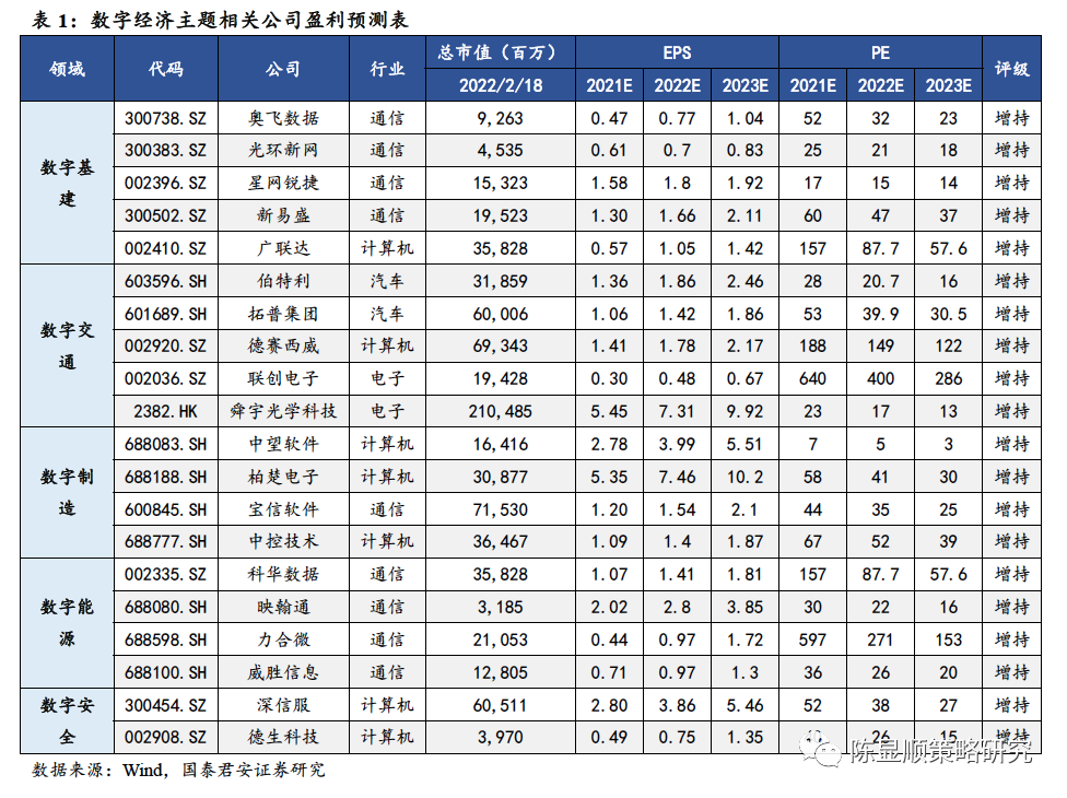 国泰君安认为,“东数西算”工程正式全面启动,全国一体化大数据中心体系完成总体布局设计。加快推动算力建设,将有效激发数据要素创新活力,加速数字产业化和产业数字化进程,催生新技术、新产业、新业态、新模式,支撑经济高质量发展。截止2020年我国数据中心机架规模达到500万架,预计十四五末期达到1800万架,近五年年均增速逾30%,或将新增1.95万亿投资。看好五大投资方向:1、数字基建:数字经济成为稳增长的重要引擎;2、数字交通:车路基础设施走向全面智能化;3、数字制造:实现制造业的系统智能化和软件自主化;4、数字能源:数字技术赋能新型电力系统构建;5、数字安全:发展数字经济的保障性工程。