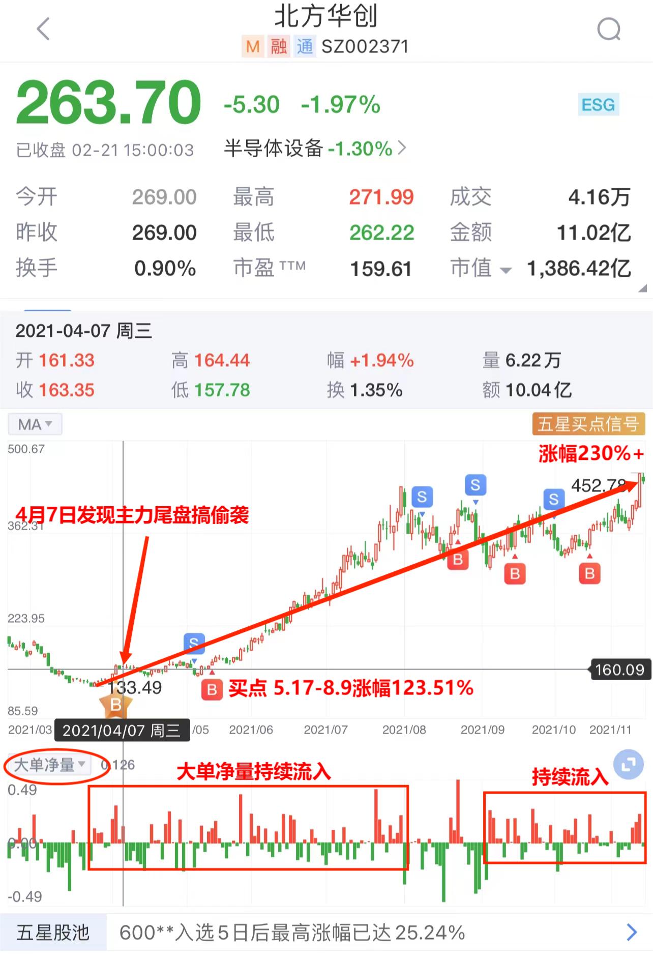 5月17日和8月9日,B/S点也发出了提示信号,北方华创从163.7元涨至373元,区间涨幅为123.51%。