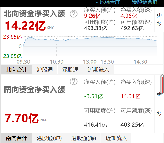 Wind数据显示,北向资金全天净买入14.22亿元,其中沪股通净买入9.26亿元,深股通净买入4.96亿元。