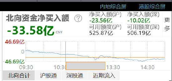 截至沪深股市收盘,北向资金全天净卖出33.58亿元,其中沪股通净卖出23.56亿元,深股通净卖出10.02亿元。