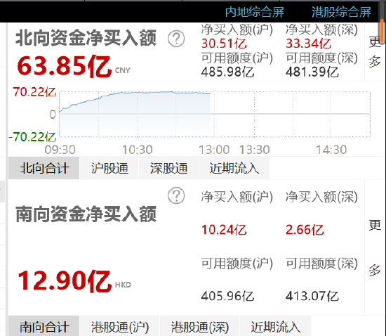 截至沪深股市午间收盘,北向资金净流入63.85亿元,其中,沪股通净买入30.51亿元,深股通净买入33.34亿元。