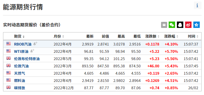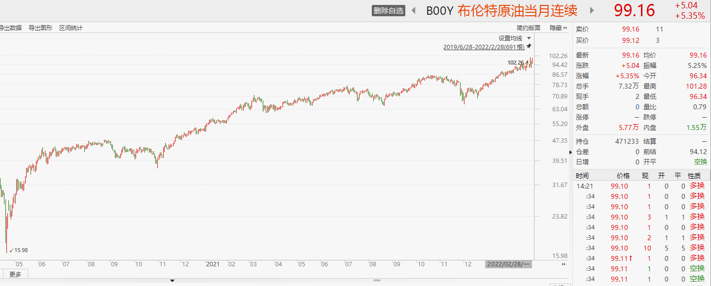 而这种涟漪的扩散,在资本市场则会掀起惊涛骇浪,2月24日,俄罗斯RTS指数的跌幅一度超过了50%,但与此向背离的则是国际能源价格的疯狂飙涨,布伦特和WTI原油均突破了100美元的关口。