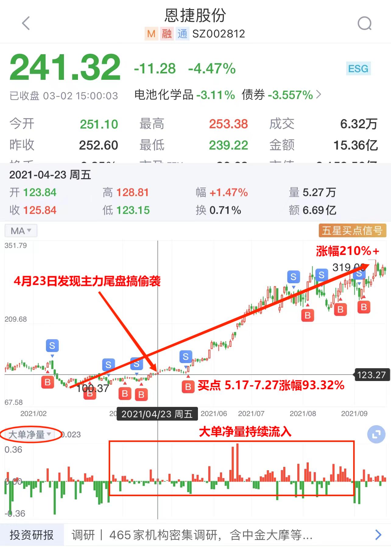 21年4月23日,尾盘掘金发现了主力潜伏恩捷股份的迹象,并在当天14点50分进行了异动提醒。同时,当天Level-2的大单净量也由流出变为了流入,这意味着有主力资金在行动。