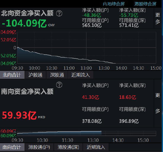 北向资金持续流出,截止发稿,北向资金大幅净流出104.09亿元,其中,沪股通净流出48.36亿元,深股通净流出55.73亿元。