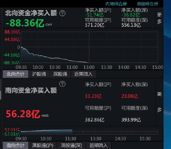 截止沪深股市午盘,北向资金净流出88.36亿元,其中,沪股通净流出51.74亿元,深股通净流出36.62亿元。