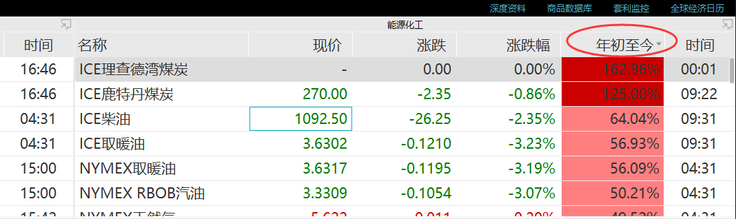 国际原油价格的持续暴涨,让煤炭价格具有了比价效应,因而也会刺激煤炭价格的上行。这也是为什么最近A股的石油、天然气、煤炭板块持续上涨的原因,因为它们都是能源。