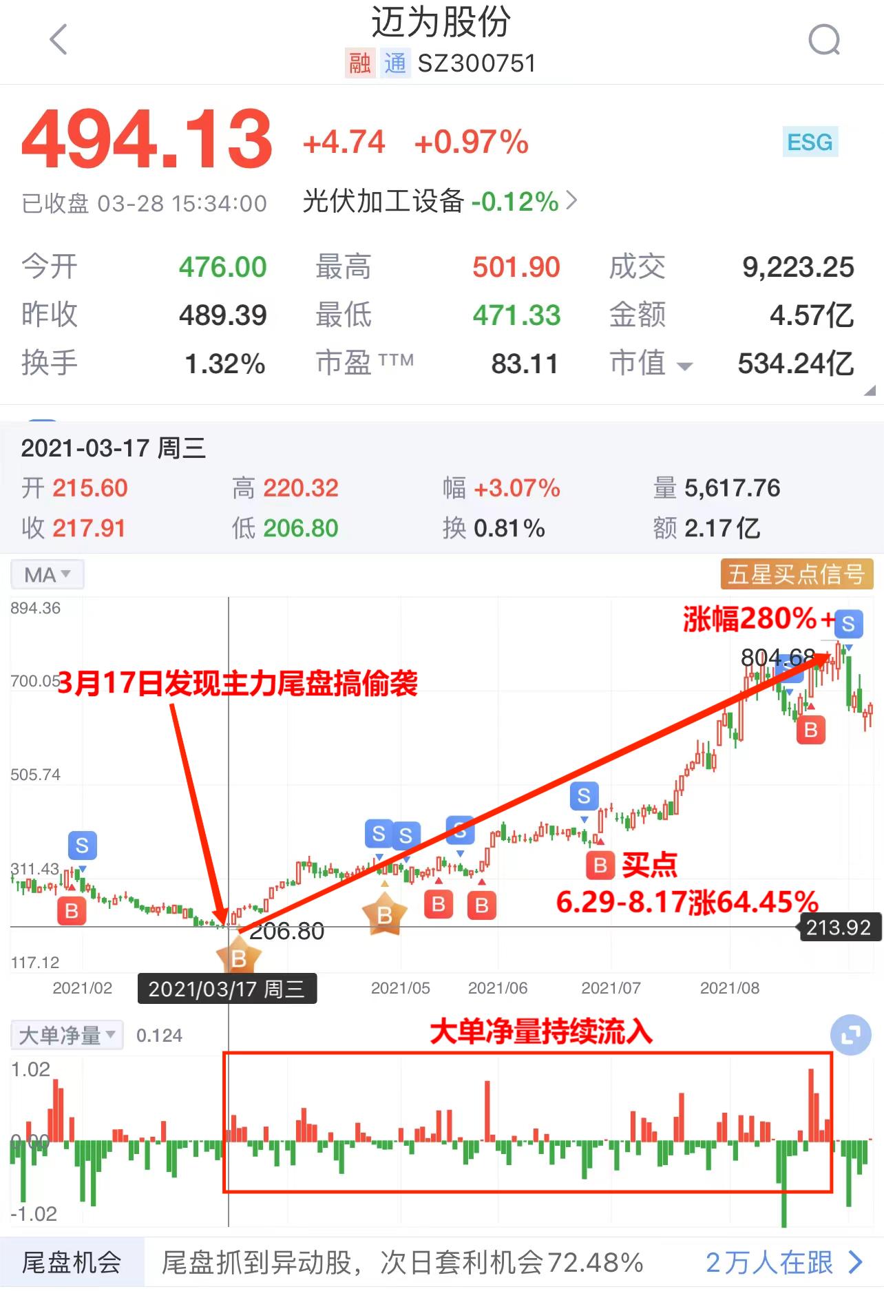 21年3月17日,尾盘掘金发现了主力潜伏迈为股份的迹象,并在当天14点50分进行了异动提醒。同时,Level-2大单净量的数据显示,3月17日当天,大单净量数据从持续流出变为了净流入。次日,迈为股份暴涨9.73%,第3天,再次大涨4.31%,2天累计暴涨14.46%。