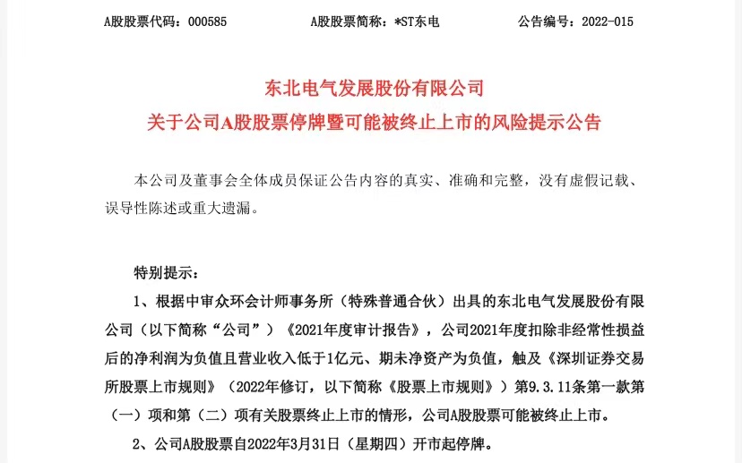 昨日晚间,*ST拉夏、*ST中新(维权)、*ST东电同时发布停牌暨可能被停止上市的公告。3家上市公司经审计的期末净资产均为负值,*ST中新、*ST东电还有多个财务指标触及退市标准,3只个股均将于今日起开始停牌。