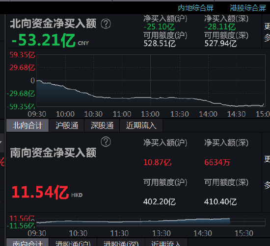 Wind数据显示,北向资金全天单边净卖出53.21亿元,此前连续3日净买入;其中沪股通净卖出25.1亿元,深股通净卖出28.11亿元。