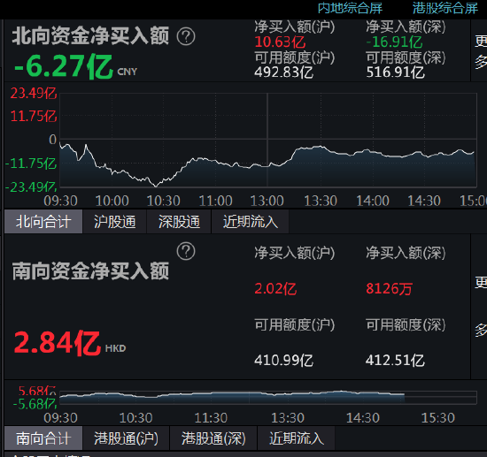 截至沪深股市收盘,北向资金净流出6.27亿元,沪股通净流入10.63亿元,深股通净流出16.91亿元。Wind数据显示,北向资金全天成交总额854.28亿元,连续13个交易日成交额低于千亿,为2020年6月以来首次。