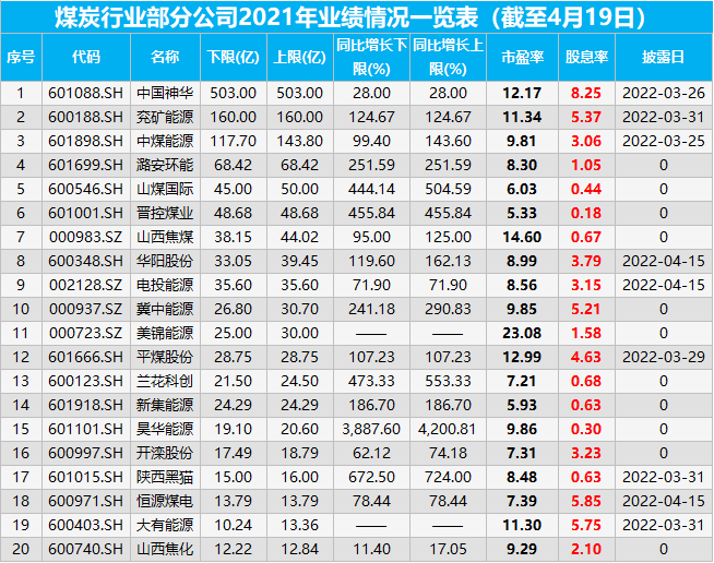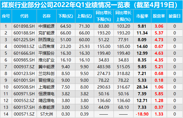 不仅是2021年的年报业绩喜人,2022第一季度的业绩继续大幅增长,中煤能源预增83.8%-103.2%为64.5-71.3亿元;兖矿能源预增193.20%为66亿元;陕西煤业预增51.22%-77.91%为51-60亿元。