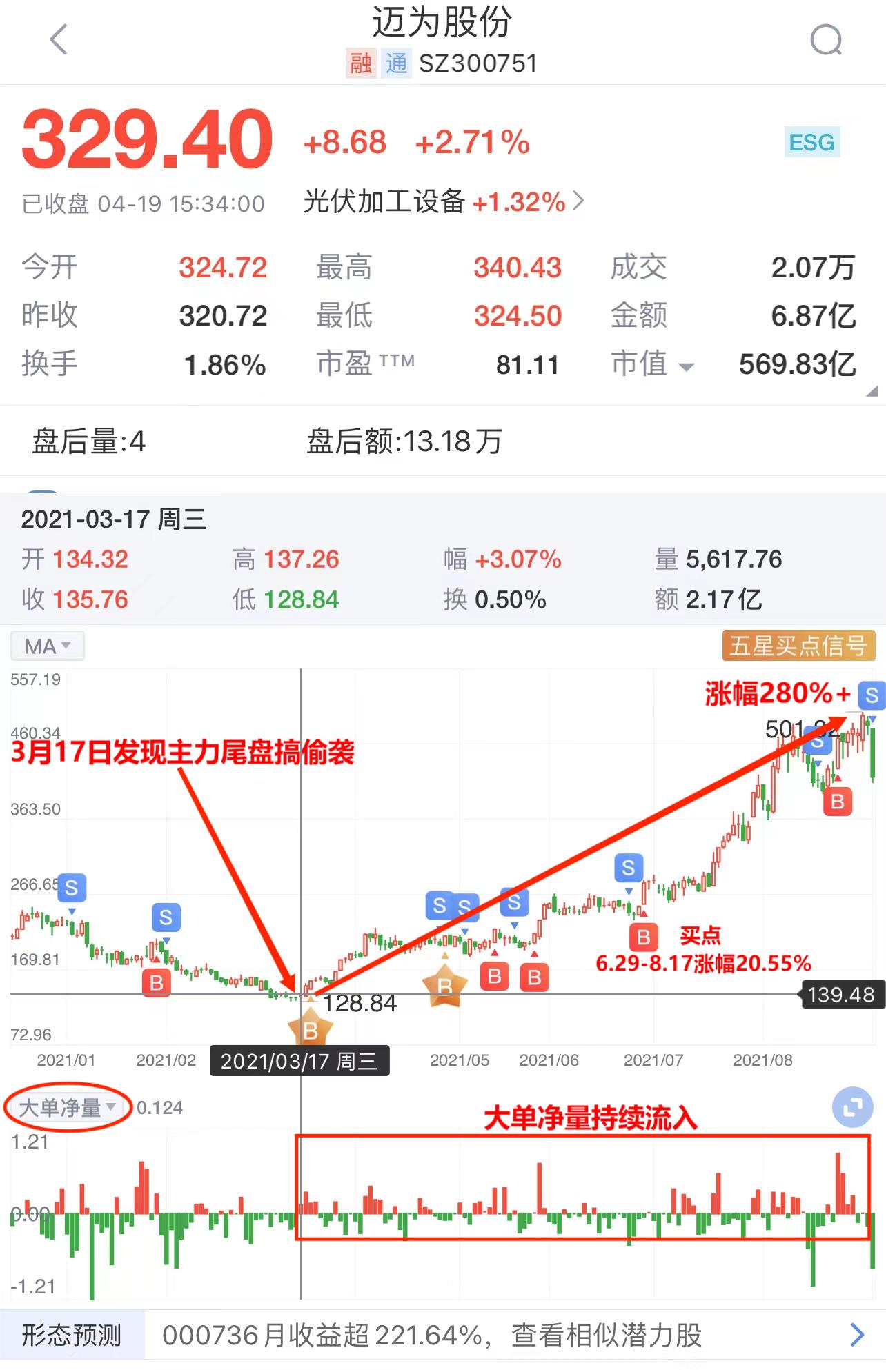 21年3月17日,尾盘掘金发现了主力潜伏迈为股份的迹象,并在当天14点50分进行了异动提醒。同时,Level-2大单净量的数据显示,3月17日当天,大单净量数据从持续流出变为了净流入。次日,迈为股份暴涨9.73%,第3天,再次大涨4.31%,2天累计暴涨14.46%。