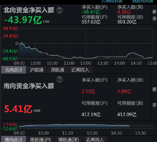 沪深股市大跌,北向资金全天净流出43.97亿元,其中,沪股通净流出48.47亿元,深股通净流入4.5亿元。