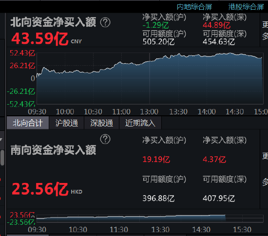 Wind数据显示,北向资金全天净买入43.59亿元,其中沪股通净卖出1.29亿元,深股通净买入44.89亿元。