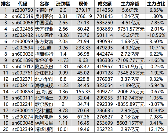 统计显示,TOP20的股票成交额超855亿元,根据查股网leve2资金流向图显示,在这20只股票中,有10只股票呈现主力资金流入,其中宁德时代主力流入净额超5亿元;北方华创主力流入净额超3亿元;招商银行、亿纬锂能、阳光电源、精华制药主力流入净额超2亿元;贵州茅台、东方财富主力流入净额超1亿元;北方稀土、保利发展主力流入净额不足1亿元。