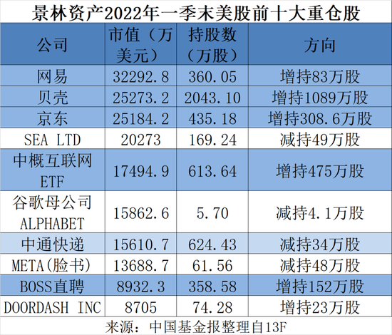 具体来看,景林资产一季度美股前十大重仓股持仓18.3亿美元,占整个美股仓位超78%。其中,中概股占6个。