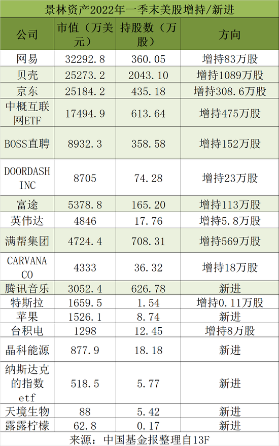 其中,前三大重仓股均为中概股:网易更是一举成为景林资产美股的第一重仓股:加仓83万股至360万股;此外,大幅增持贝壳和京东,为第二、三重仓股。此外,还直接大幅增持中概互联网ETF……不过,也清仓了造车新势力理想和小鹏。