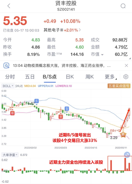 以今日大涨的贤丰控股为例,通过查股网Level-2的大单净量发现,主力资金持续涌入该股,而近期,B/S点信号再度发出,之后该股累计大涨33%,意味着该股近期获得资金关注。