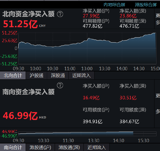 Wind数据显示,北向资金全天净买入51.25亿元,其中沪股通净买入27.39亿元,深股通净买入23.86亿元。