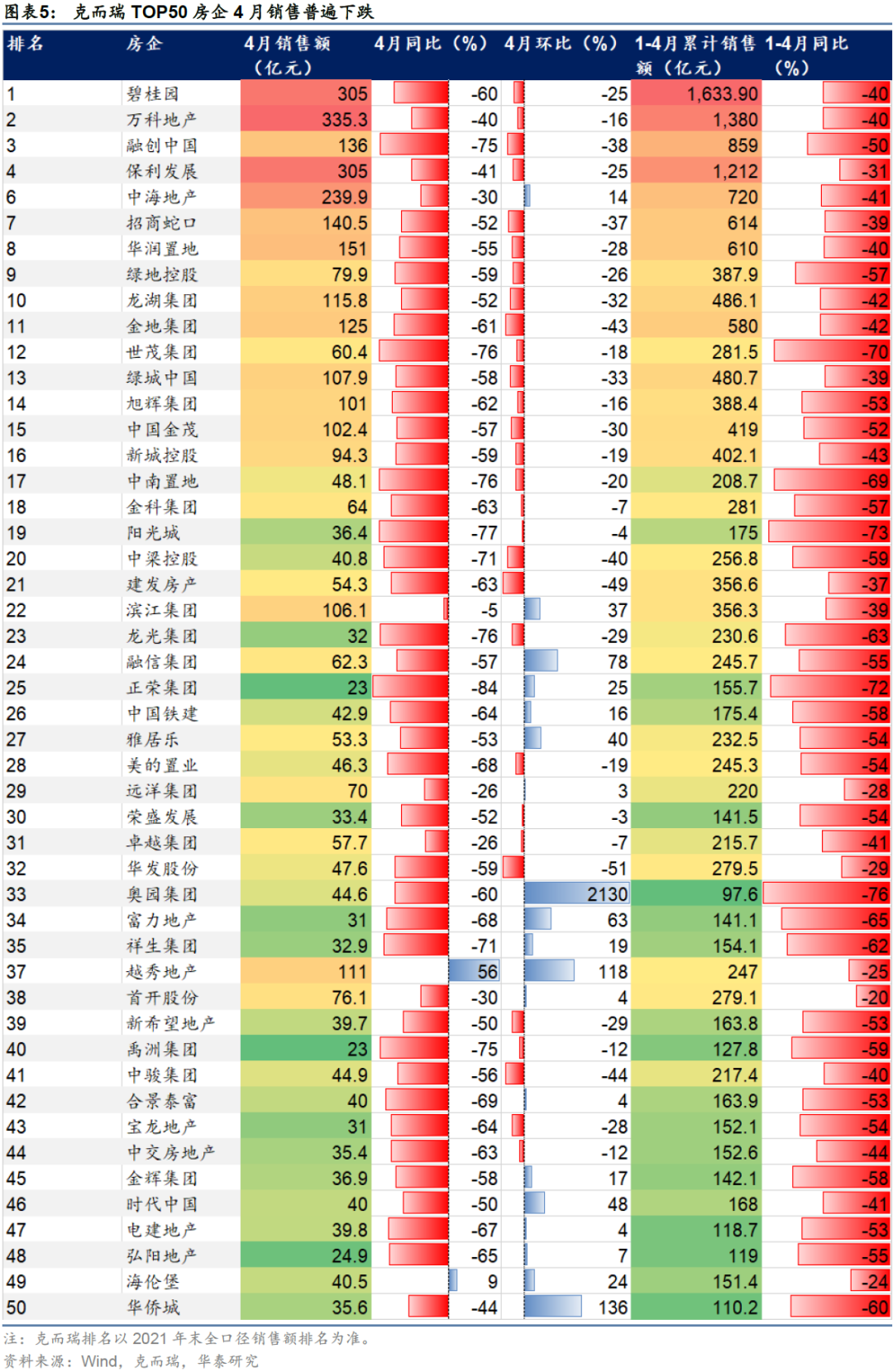 华泰证券指出,稳地产、稳预期迫在眉睫。4月金融数据、经济数据先后发布,地产各项指标不容乐观。4月居民住房贷款同比大幅少增,单月地产开发投资同比-10.1%,商品房销售额同比-46.6%,跌幅较3月走扩20.4个百分点。宏观数据反映出地产需求端不景气、融资端疲软,微观数据同样印证了这一点。4月克而瑞TOP50房企销售继续大面积下跌,多数房企同比降幅超30%。4月房企发债融资仍以央国企为主,民企净融资持续为负。因此,稳地产还有待宽松政策继续发力。此外,稳地产也是稳信用的关键,低迷数据造成的市场悲观预期,也亟需政策释放积极信号予以对冲。