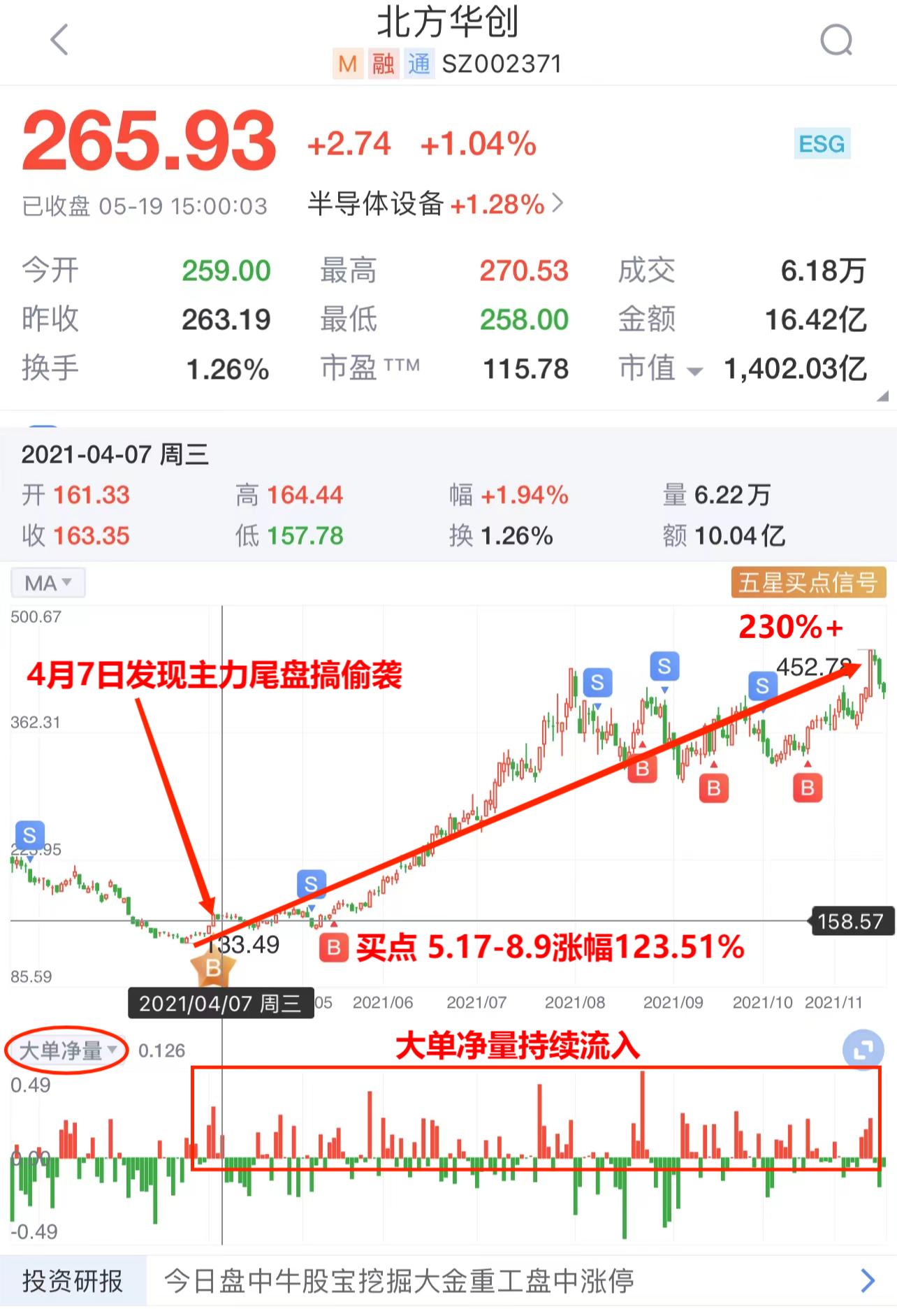 21年4月7日,尾盘掘金发现主力在北方华创的尾盘搞偷袭,并在当天的14点50分进行了预警提示。同时,当天Level-2的大单净量也暴力流入,这意味着有主力资金在行动。
