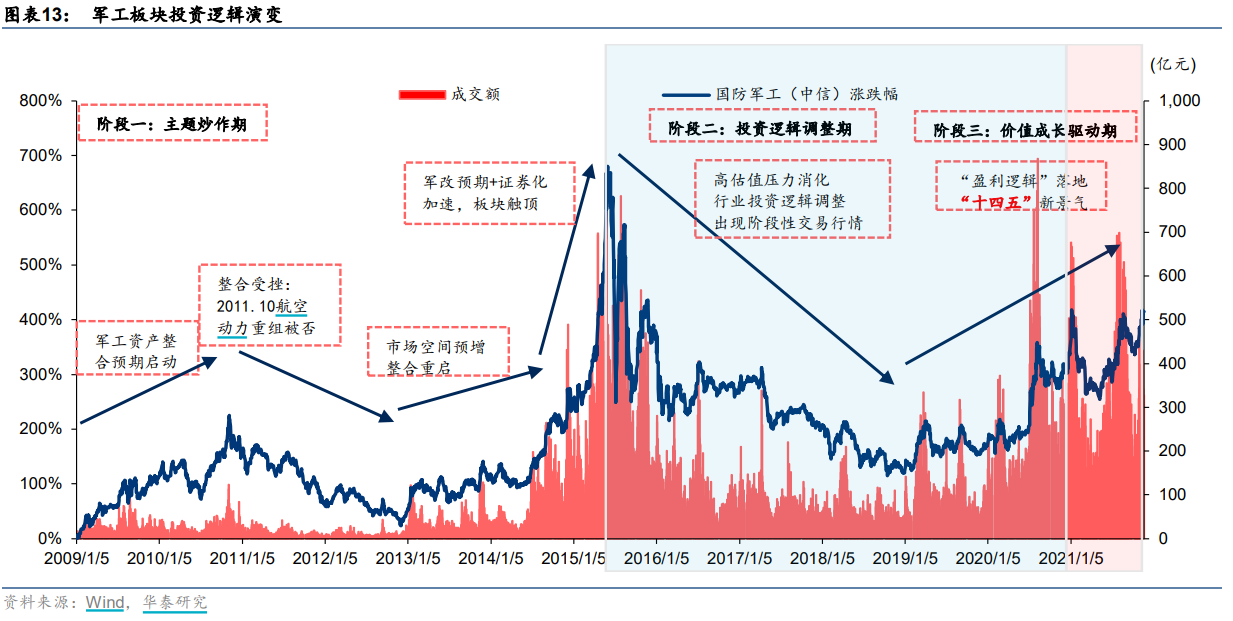 2010年以来军工板块投资逻辑几变,鉴于军工装备大多以5年为一周期,且与宏观国家发展规划密切相关,可大致划分为三大阶段: