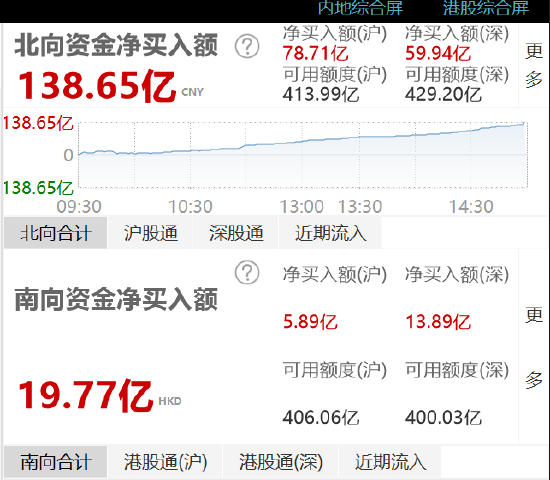 北向资金全天单边净买入138.65亿元,创年内次高,沪股通净流入78.71亿元,深股通净流入59.94亿元,MSCI多只指数样本调整今日盘后生效。