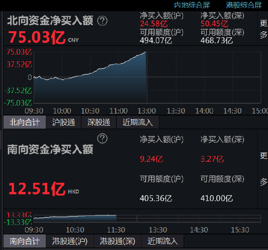 北向资金半日净流入75.03亿元,沪股通净流入24.58亿元