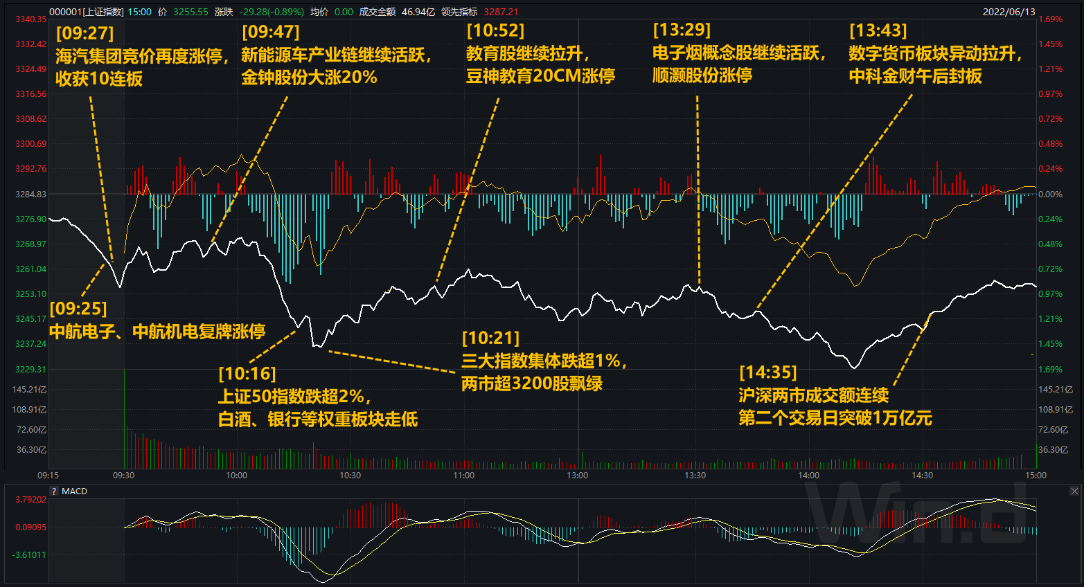 6月13日,三大指数全线低开,盘中指数宽幅震荡,沪指跌幅一度扩大至1.5%,汽车产业链逆势爆发。午后指数弱势盘整,数字货币、烟草概念股先后拉升。总体来看,市场仍处在筑底阶段,权重股回调拖累指数。截至收盘,沪指收跌0.89%,深成指下挫0.3%,创指下跌0.39%,两市超2300股上涨,北向资金净流出超130亿元。