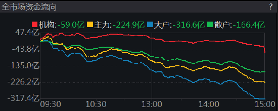 根据wind数据,今日机构、主力、大户、散户全市场全部净流出,其中,主力流出225亿,大户流出逾300亿。