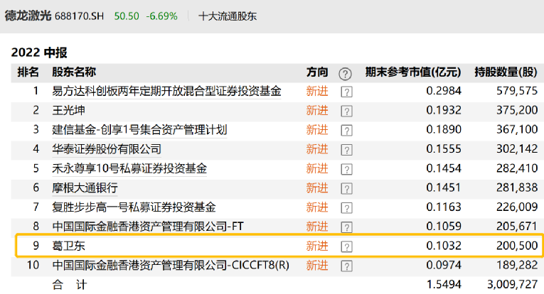 8月29日晚间,科创板公司德龙激光发布的半年报显示,私募大佬葛卫东在今年二季度建仓了该股,新进前十大流通股东,持有20.05万股,期末持股市值为1032万元。与此同时,易方达科创板两年定期、百亿私募复胜资产、外资摩根大通银行等也积极布局了德龙激光。