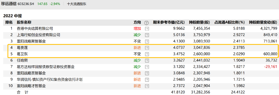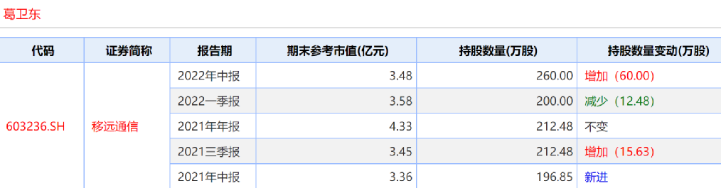 葛卫东是在2021年二季度新进移远通信股东名单的,彼时持有196.85万股,如今一年多时间过去了,总体来看是在加仓的。