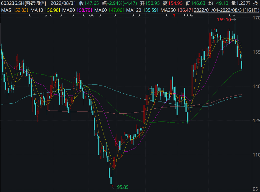 从股价表现来看,移远通信近一年多来波动非常大,去年涨幅超42%;但是今年跌了5.46%,一度跌至95.85元/股附近,随后大涨,走出了一个V型。截止8月31日收盘,移远通信报收147.65元/股,总市值为279亿元。
