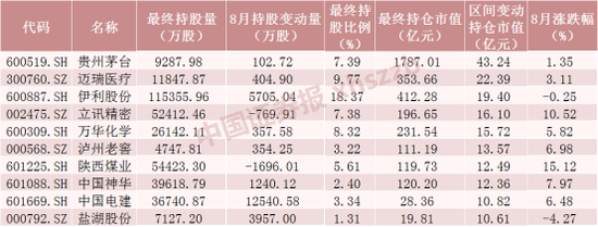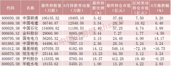 8月北向资金持股增加数前十个股