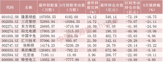 8月北向资金持仓市值减少额居前十的股票中,除隆基绿能、汇川技术、比亚迪被北向资金分别加仓6192.68万股、880.97万股、13.88万股外,其他股票被减仓,其中三花智控、东方雨虹、阳光电源、埃斯顿、特变电工被减仓超1500万股。
