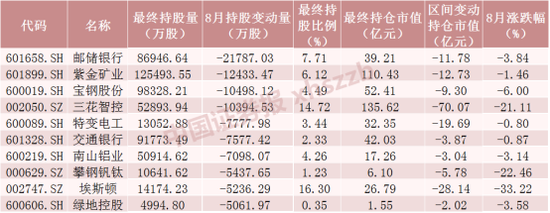 8月北向资金减仓股数前十个股