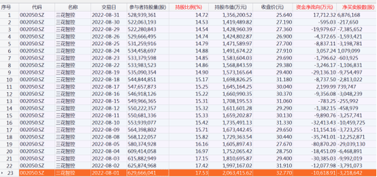从成交均价和减仓股数来计算,三花智控为8月北向资金减仓金额最高的个股,减仓1.04亿股,减仓金额达30.69亿元。从明细数据来看,8月北向资金多数交易日减仓三花智控,其中8月5日减仓超8亿元。