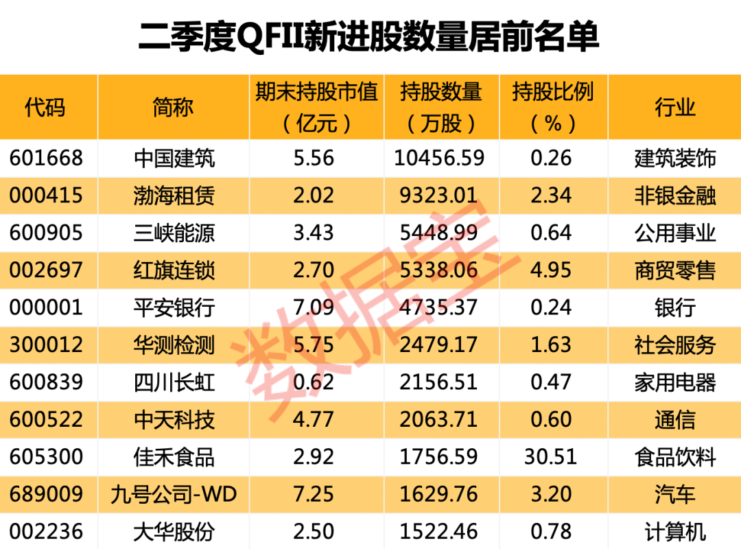 从新进股数量来看,中国建筑在二季度获得QFII新进股数量最多;新加坡政府投资有限公司新进持有1.05亿股,期末持股市值达5.56亿元,位列第十大股东。二季度,中国建筑同时还获得北上资金和社保基金分别增持20.87亿股和1.68亿股。渤海租赁、三峡能源、红旗连锁在二季度均获得QFII新进增持超5000万股。
