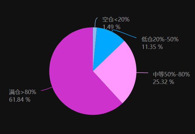具体来看,61.84%的股票私募仓位超过8成,另有25.32%的股票私募仓位介于5-8成之间,仅有1.49%的股票私募仓位低于2成。