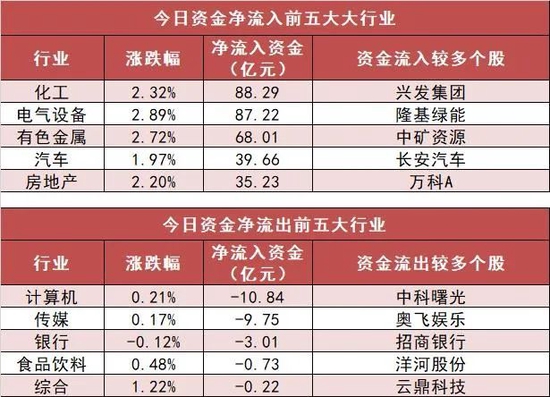 申万一级行业中,23个行业实现资金净流入,其中化工行业净流入88.29亿元居首。