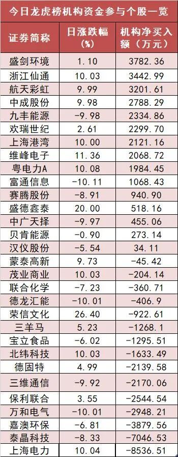 盘后龙虎榜数据显示,机构现身30股,其中盛剑环境等15股现机构资金净买入,上海电力等15股呈现机构资金净卖出。