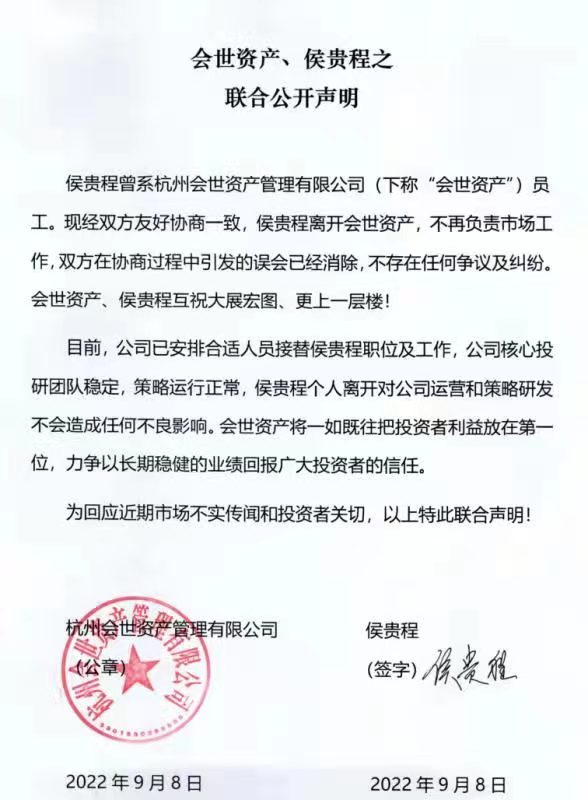相关渠道人士今日向记者透露,会世资产已经就此事于9月9日与侯贵程发布联合公开声明。该声明称,侯贵程曾系会世资产员工,现经双方友好协商,侯贵程离开会世资产,双方在协商过程中引发的误会已经消除,不存在任何争议及纠纷。