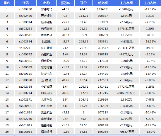另有13只股票呈现主力资金净流出,其中宁德时代主力流出净额超13亿元;比亚迪主力流出净额超4亿元;长安汽车主力流出净额超3亿元;亿纬锂能、东方财富、紫金矿业、隆基绿能主力流出净额超2亿元;通威股份、五 粮 液、贵广网络主力流出净额超1亿元;西藏矿业、阳光电源、招商银行主力流出净额不足1亿元。