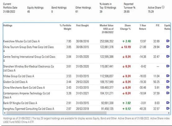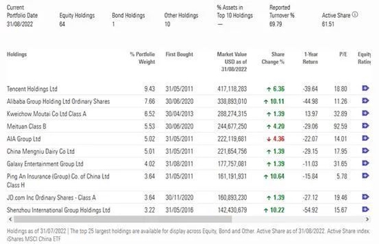 截至8月末,富达国际旗下中国消费动力基金的前十大重仓股分别为腾讯控股、阿里巴巴、贵州茅台、美团、友邦保险、蒙牛、银河娱乐、中国平安H股、京东、申洲国际。
