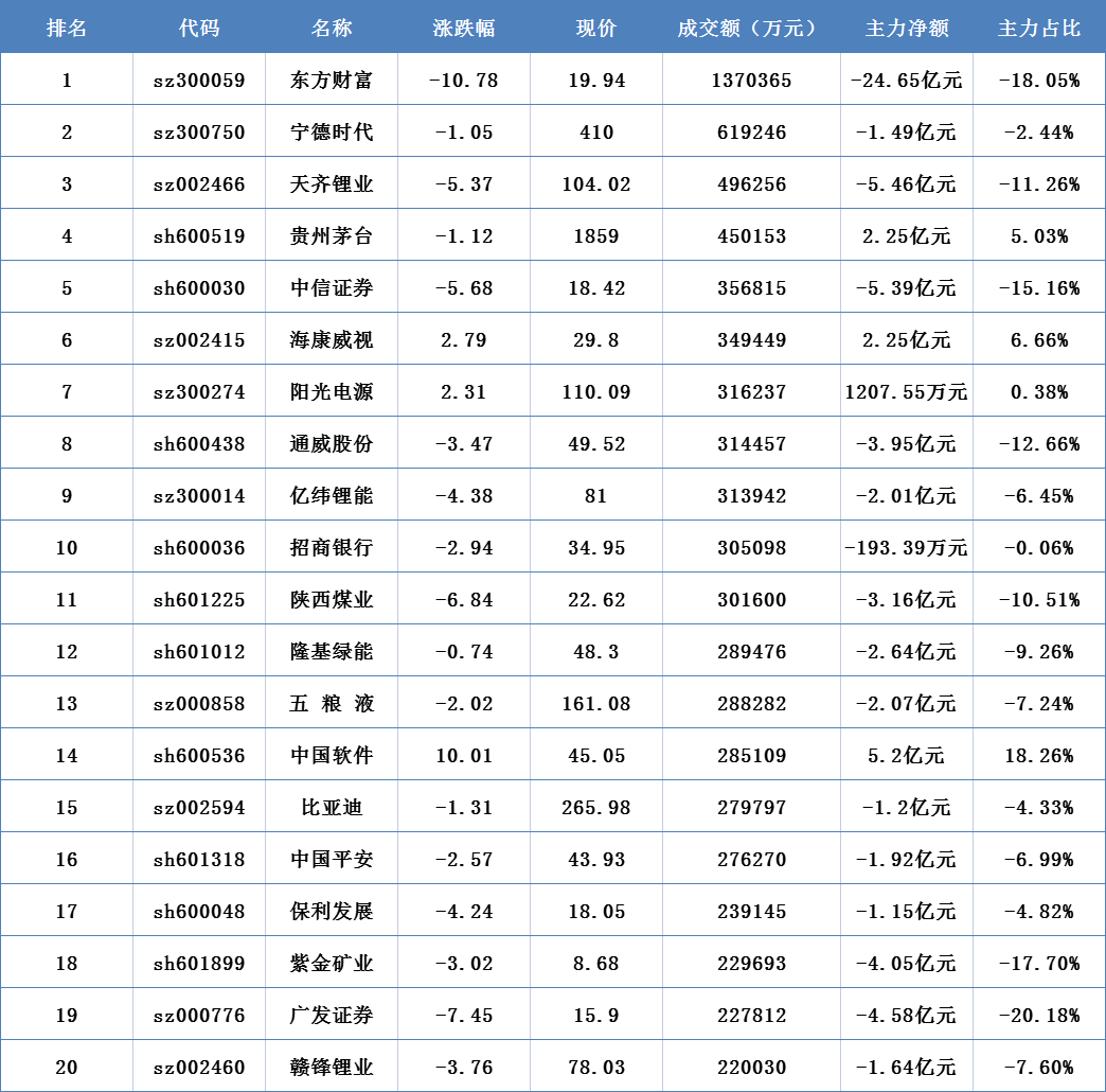 另有16只股票呈现主力资金净流出,其中招商银行主力流出净额超193.39亿元;东方财富、天齐锂业、中信证券、主力流出净额超5亿元;宁德时代、通威股份、亿纬锂能、陕西煤业、隆基绿能、五粮液、比亚迪、中国平安、保利发展、紫金矿业、广发证券、赣锋锂业主力流出净额超1亿元。