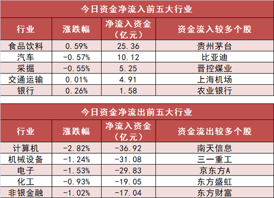 28个申万一级行业中,7个行业实现资金净流入,其中食品饮料行业净流入25.36亿元居首。